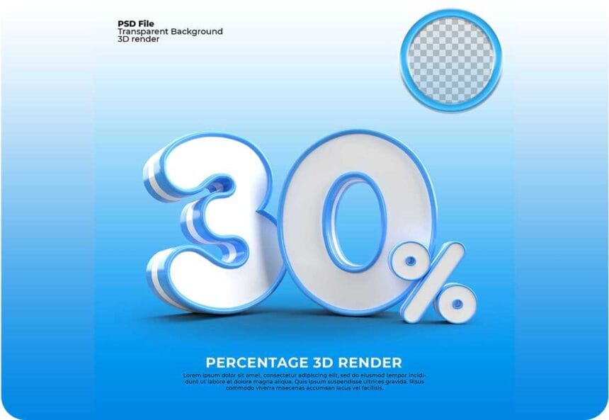 Impress your audience with dynamic 3D PSD numbers illustrating a significant 30% growth, presented in a bold and striking blue hue. These attention-grabbing elements are perfect for visualizing data, highlighting achievements, or adding a modern touch to your design projects.