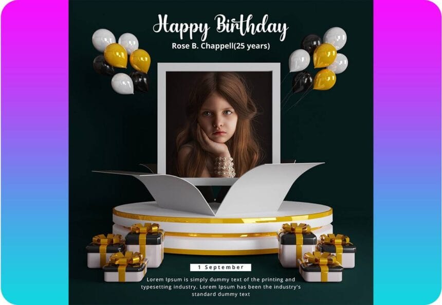 Elevate your birthday designs with our realistic PSD mockup featuring a birthday frame adorned with Balloons and a gift box, perfect for creating memorable and festive graphics. This versatile template provides a charming backdrop for your birthday invitations, greeting cards, or social media posts, infusing them with warmth and celebration. The lifelike balloons and gift box add a touch of whimsy and excitement, while the customizable smart objects allow you to effortlessly insert your artwork or messages onto the frame. Whether you’re planning a birthday party or designing birthday-themed graphics, this mockup offers endless possibilities to express your creativity. Download now and make every birthday truly special with our realistic PSD mockup!
