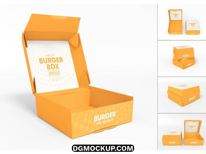 - A complete bundle of 4 unique PSD mockups for burger packaging boxes