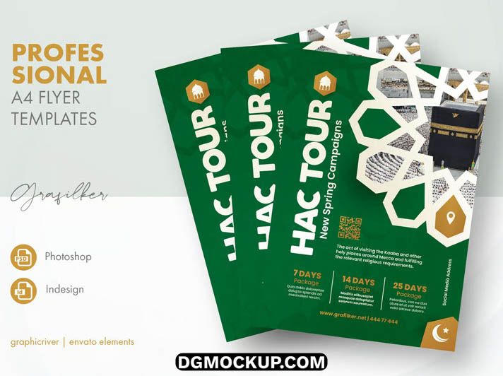 You Hajj & Umrah Tour Promotional Flyer Free PSD Template can quickly update text, colors, and images to suit your branding. Perfect for both Free PSD Mockup print and digital use, this flyer helps you market your Hajj and Umrah packages effectively while maintaining a spiritual and professional aesthetic. With high-resolution quality and a layout designed for maximum Social Media Post  impact, this promotional flyer is an essential resource for agencies aiming to attract clients and build trust. Download now and start creating impactful promotional materials for your pilgrimage tours with a design that inspires confidence. You Can Also Download a Free 2025 Design Template.