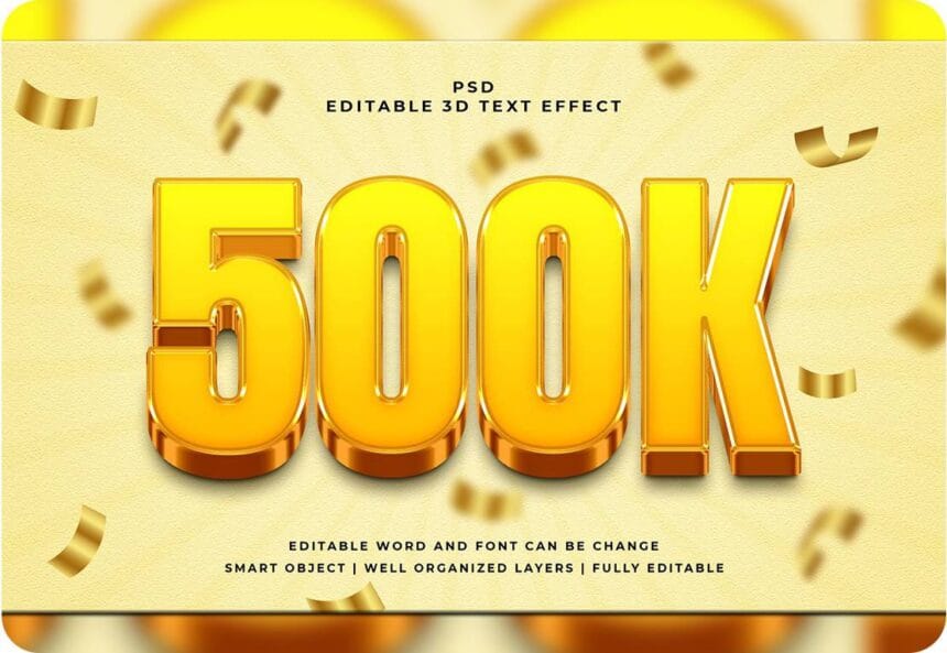 Elevate your designs to new heights with our PSD 500K 3D Editable Text Effect with Background. This versatile text effect offers a captivating blend of style and depth, perfect for adding impact to your graphics. Whether you’re designing posters, social media graphics, or promotional materials, this text effect provides a professional and eye-catching touch. With customizable smart objects, you can easily edit the text, adjust the colors, and fine-tune the background to create stunning visuals that command attention. Download now and unlock the potential to create unforgettable designs!