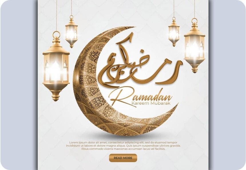 Embrace the spirit of Ramadan with our PSD poster template featuring a crescent moon illuminated with light. Download now for a captivating design that symbolizes the blessings of the holy month. Perfect for promoting events, activities, or sharing greetings during Ramadan