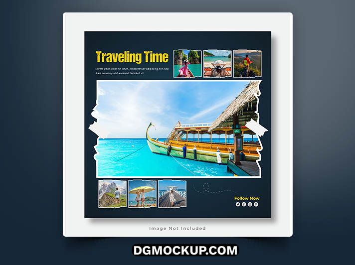 This modern Stylish 7-Photo Travel Collage Frame PSD with Ripped Paper and visually engaging Collage Frame PSD template is perfect for travel bloggers, collage designing fans, and tourism-based Photo Frame Mockup content. It features seven photo slots, each styled with a creative ripped paper edge, giving it a trendy scrapbook effect. The Social Media Post bold navy background and soft shadow enhance the overall premium look, while a vibrant yellow “Traveling Time” title immediately grabs attention. You can Also Download Free Business Cards.Stylish 7-Photo Travel Collage Frame PSD with Ripped Paper The Stylish 7-Photo Travel Collage Frame PSD with Ripped Paper large center frame is ideal for your main highlight photo, Magazine Mockup with six smaller ones around it for supporting shots. Whether you’re sharing a tropical beach vacation, mountain adventure, or family holiday, this editable PSD template helps you tell wedding album PSD the story beautifully. The design also includes follow icons for social promotion and fully layered smart objects, making customization a breeze. Images Free PSD Mockup are not included in the file—you can easily add your own with just a few clicks in Photoshop.
